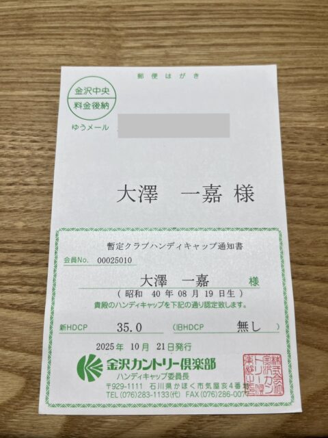 人生初のハンディキャップを取得しまた。まぁ35ってなんの自慢にもならん話ですがw