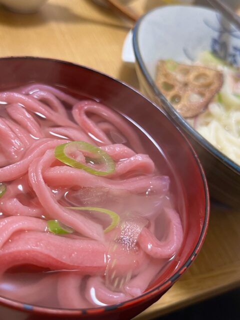 友達の上荒屋のうどん屋さんから紅白うどんをいただきました。元々センスの塊みたいな人やけど、これも大変よろしゅうございました!